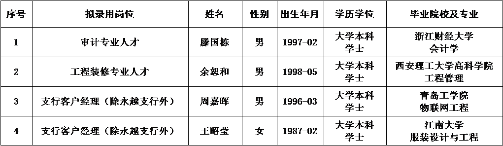 | 桐鄉(xiāng)農(nóng)商銀行2024年秋季招聘擬錄用名單 |